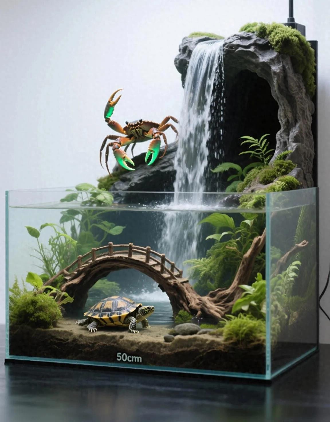 新手必看50cm水陆缸造景攻略乌龟恶魔蟹和谐共处,零漏水秘籍公开