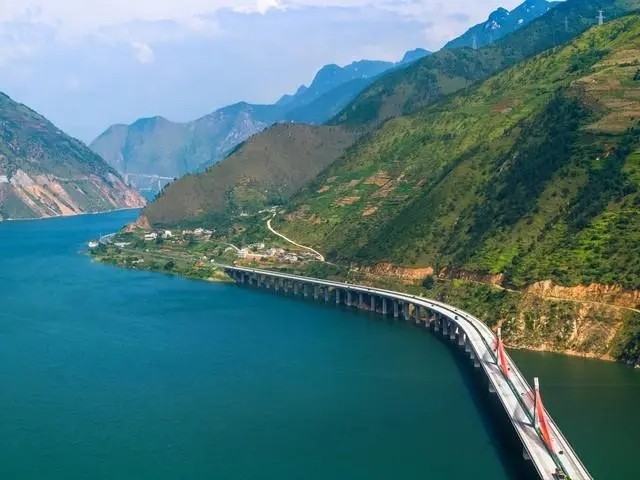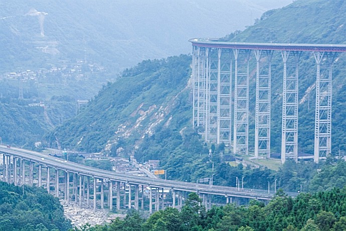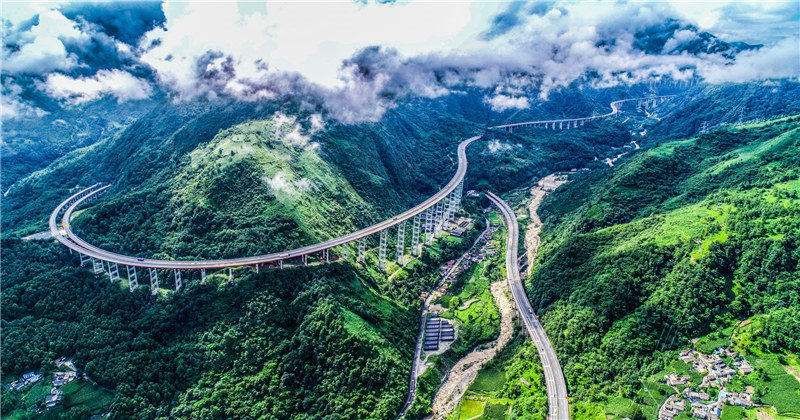 崇山峻岭、海子湖泊之上,架起钢架,托起路面,在水面掠过,在群山之内蜿蜒盘旋。泥巴山与拖乌山构造的天堑,变为了通途。