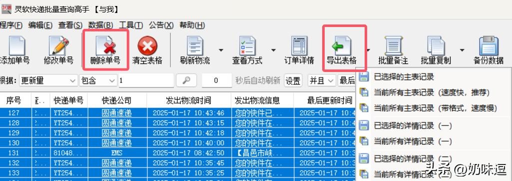 8.导出或管理结果:如需导出查询结果,可使用“导出表格”功能将信息保存到电脑;若需删除单号,可选中并点击“删除单号”进行操作