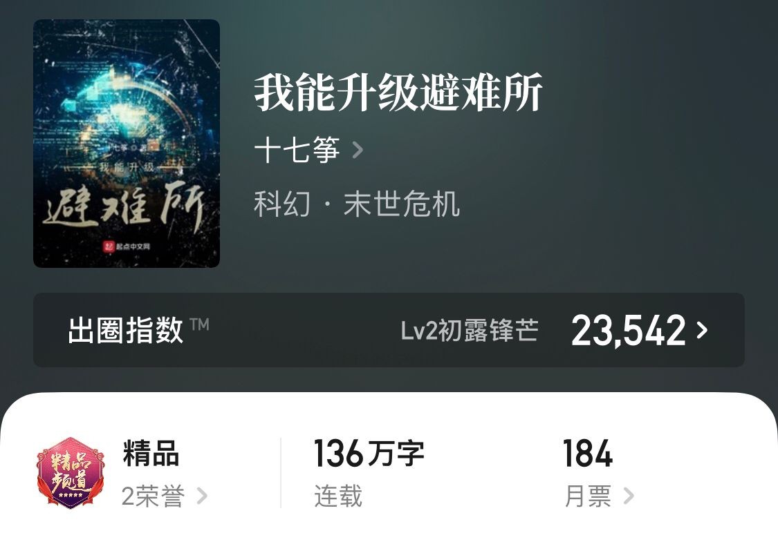除了以上几本的牧场类型种田文之外,目前正在连载中的由十七筝所著的,末日种田科幻文《我能升级避难所》有一百多万字了,比较肥了。