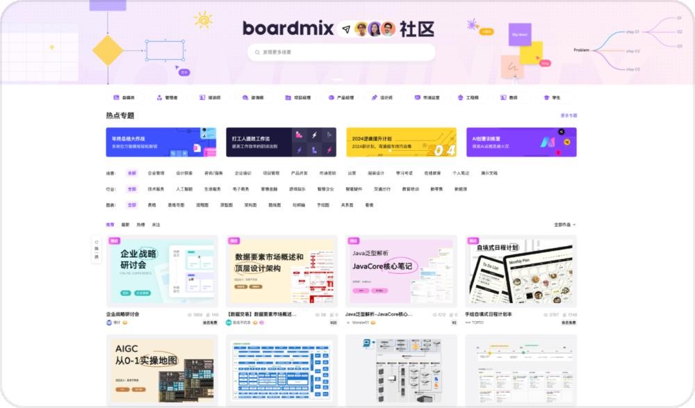 boardmix模板社区,是在线白板软件boardmix推出的模板分享网站,这里汇集了海量的模板资源,包括PPT模板、个人简历模板、手帐模板、流程图模板、思维导图模板、康奈尔笔记模板、SWOT分析模板、商业画布模板、用户旅程模板等,各类模板应有尽有,适用于不同的场景、行业和用户人群。