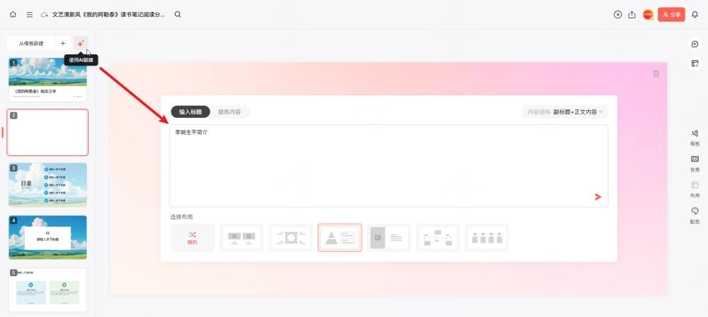 点击博思AIPPT编辑器左上角的“使用AI新建”按钮,在新页面中输入标题,下方选择一个布局,就会快速生成一页新的PPT,完全无需自己动手,效率拉满!