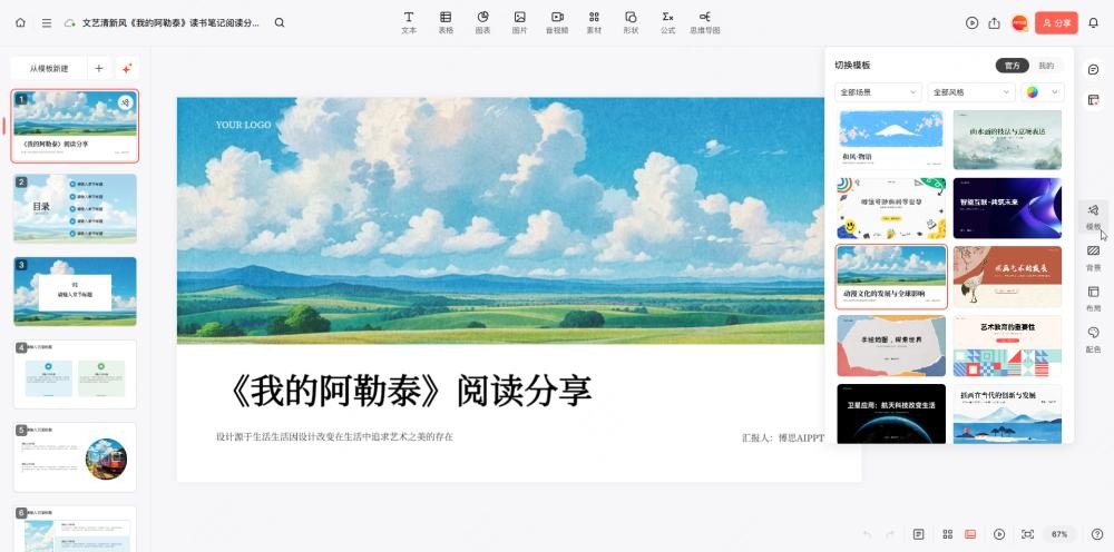 相比下载到本地,使用博思AIPPT在线编辑PPT有诸多好处,如果对当前的PPT模板不满意,可以点击编辑器右侧的模板按钮,会弹出切换模板的浮窗,从中选择其他的模板,可一键切换整个PPT所使用的模板。