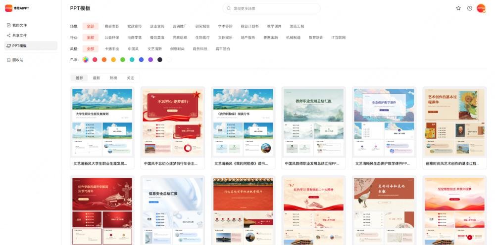 博思AIPPT模板,是在线PPT软件“博思AIPPT”推出的模板中心,这里汇集了上百个高质量的PPT模板,为方便找到所需的PPT模板,顶部提供了4个筛选项,可点击实现快速筛选——