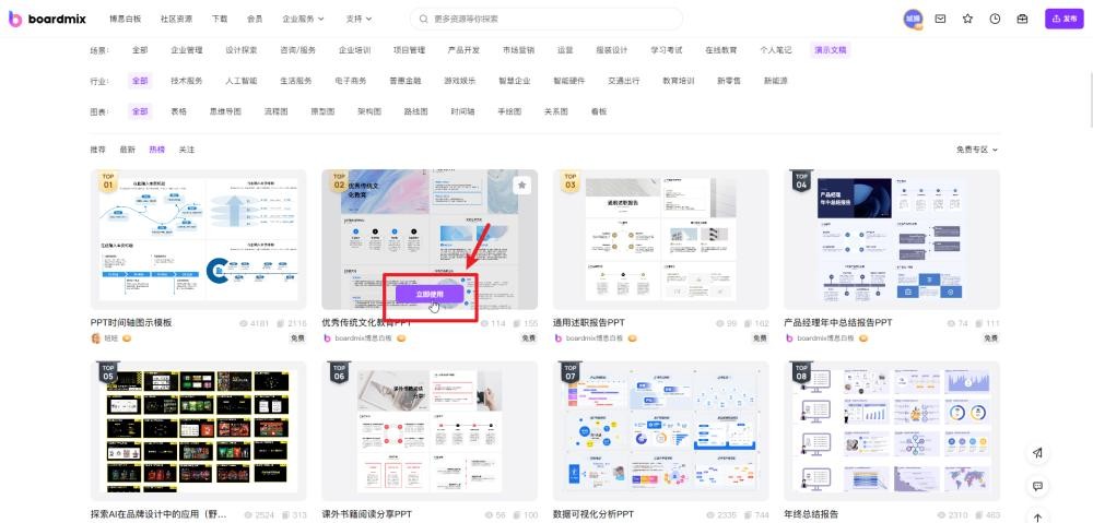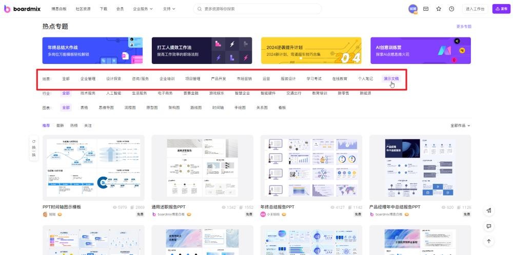 在浏览器打开boardmix模板社区的首页,点击「场景」末尾的「演示文稿」,可以快速筛选出社区中所有的PPT模板。