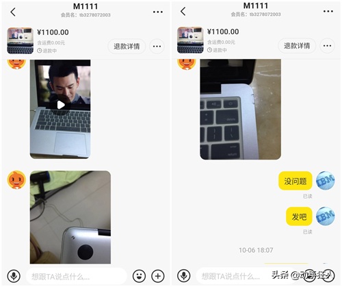 这个时候卖家就故作惊讶了,开始咋呼起来了,各种说不可能不开机,发货前给我发过视频,有开机视频的图片的,而且经过我的仔细查看,发现机器还有很多地方与卖家出售的图片上的电脑不一致的情况,不仔细看还真看不出来,比如开机按键变形了,有烫过的痕迹,当我说起这个问题时,真是巧了,卖家发货前刚好有个开机按键地方的局部图片,卖家立马截图给我,并且怀疑的说电脑不是他的,他的电脑开机按键是完好的,这个时候我立马意识到,我遇到骗子了,本来我看卖家还有其他类似的电脑出售,好意的提醒是不是发错货了,结果卖家开始人恶人先告状了,开始用语音骂我了,这就奇葩了,现在大家明白了点吧,商家故意在发货前主动的发拍摄商品图片来,然后发货的时候发个另外一个很相似的商品来,当你说收到的商品不一样时,卖家立马用聊天记录来试图证明他的“清白”,这种小伎俩小套路立马现行了,这是第一个坑,下面来看卖家的第二个坑。