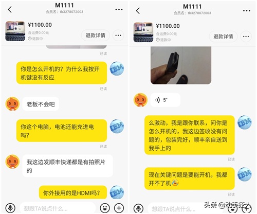 等了大概2天左右的时间,快递送货到了,正常签收,没毛病,卖家看到快递信息后,第一时间就给我发来消息,让我尽快确认收货,可是,这个时候我就发现了问题,电脑外观上看起来没啥问题,但电脑无法开机,按开机没有任何反应,经过多次尝试开机都没有用,我及时联系了卖家,且看下图: