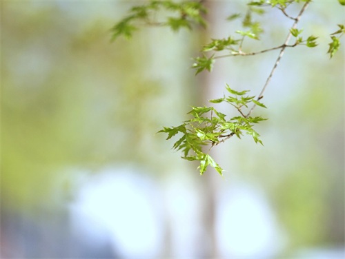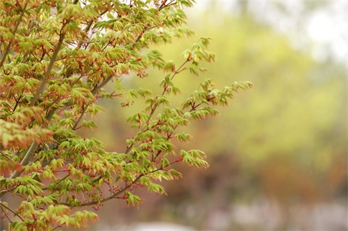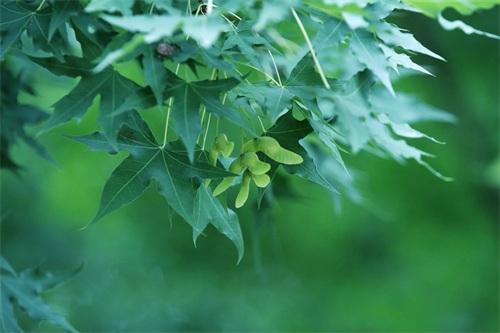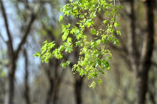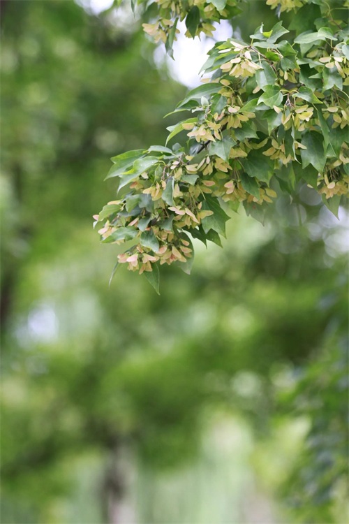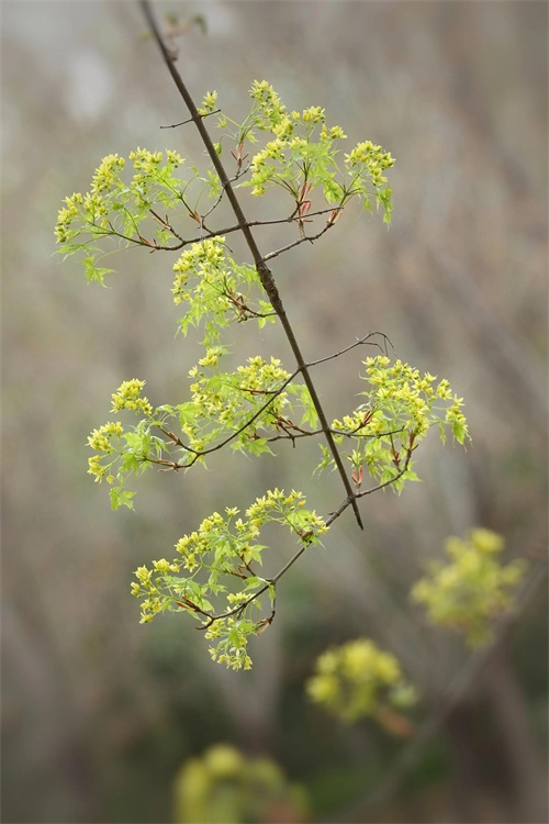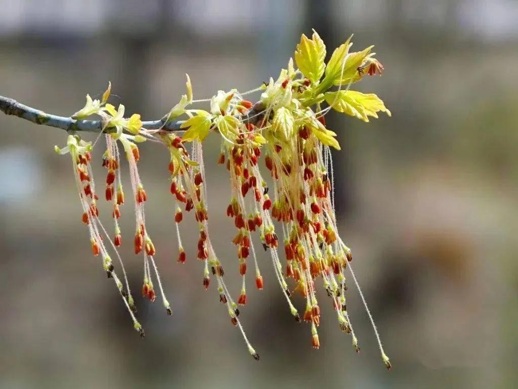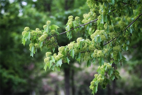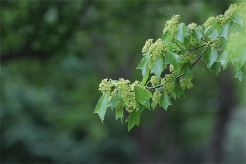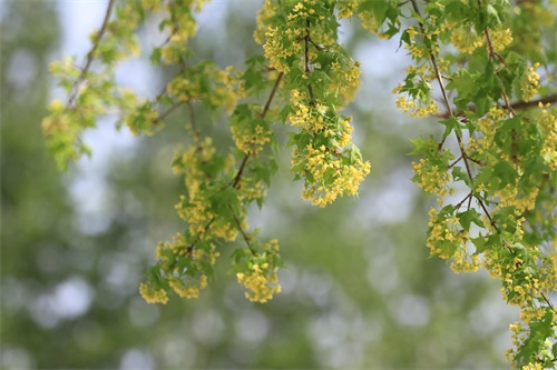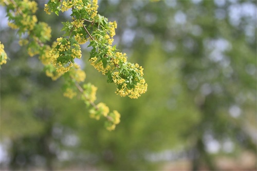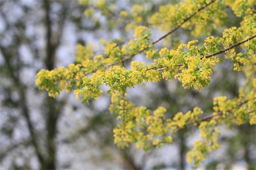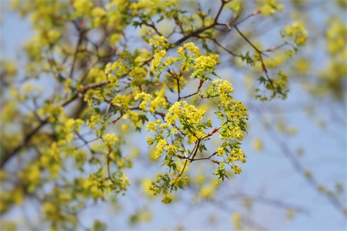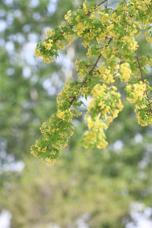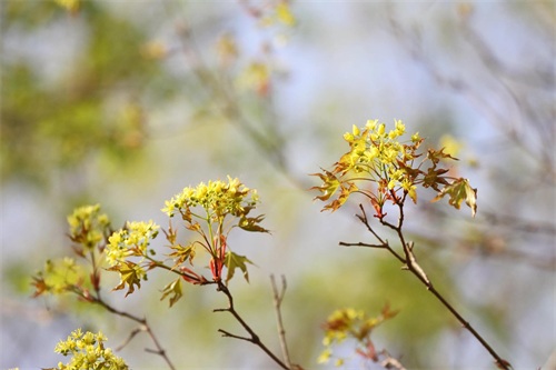 槭树4-5月开花。它的花相对于它的秋叶,要低调的多。槭花小,花和嫩叶同出或先叶后花,颜色多为黄色或黄绿色,少有红色或紫红色的。