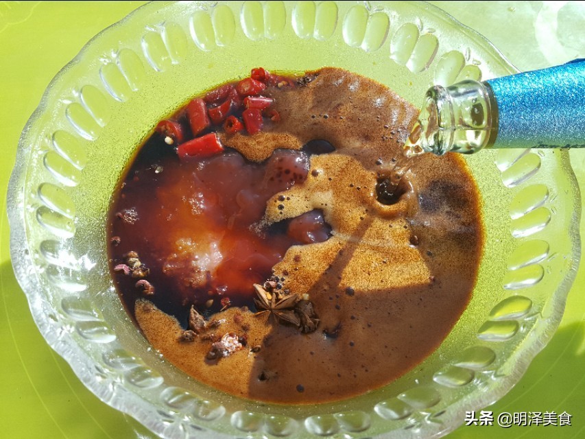 8.在将啤酒倒在放好调味料的碗中,将它们和制均匀备用。