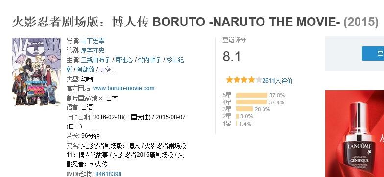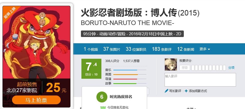 而新的一周也有几部新片必须要说的,首先是动漫迷和“火影迷”的福音,《火影忍者剧场版》已确定将于2.18日国内上映。目前豆瓣评分8.1分,时光评分7.4分,预计在上映之后会有所变化。