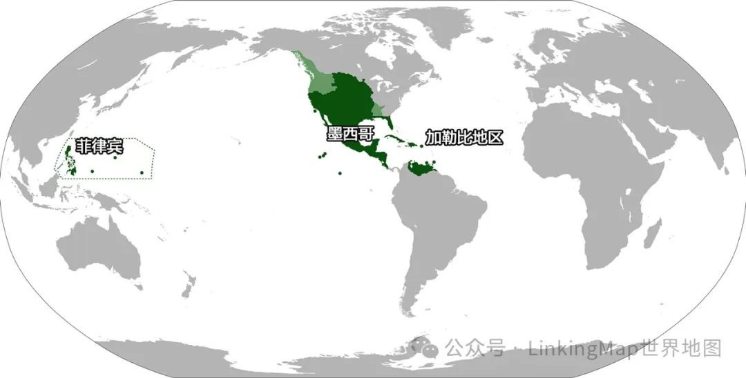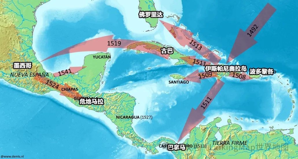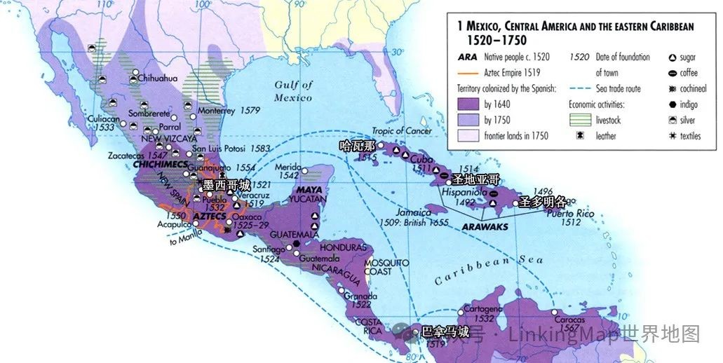 ▲加勒比、中美洲、墨西哥主要殖民地和城市建立时间