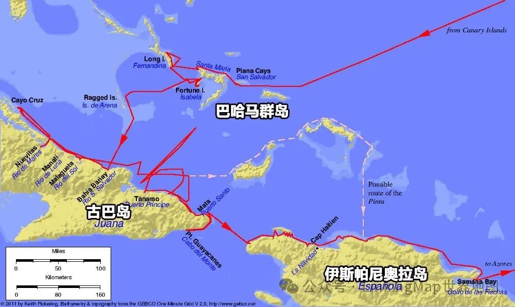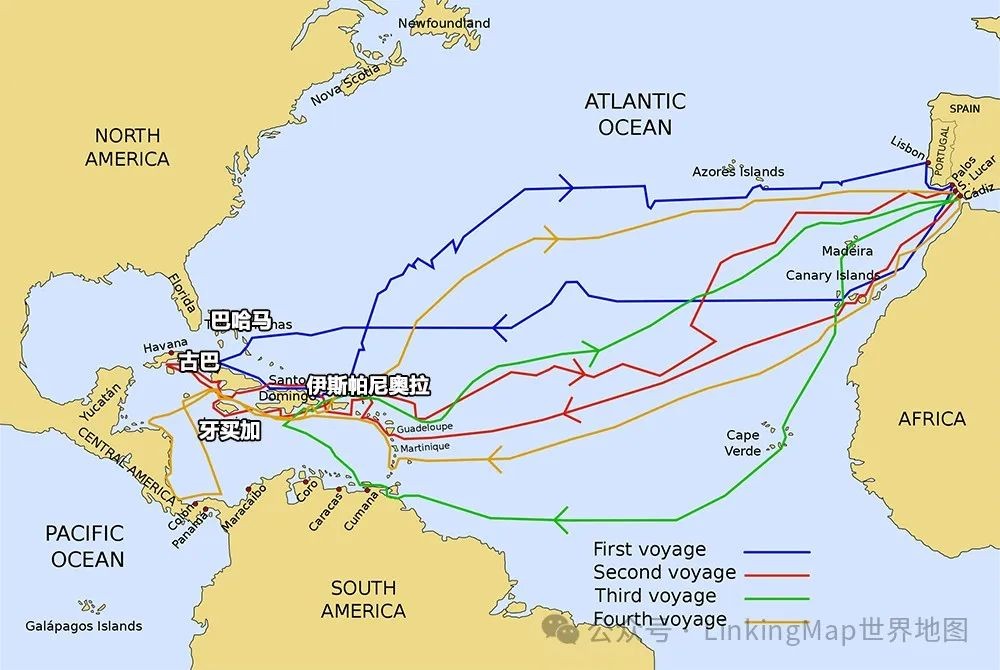 1492年10月,哥伦布在经历了2个多月的航行后,抵达了加勒比海外围的巴哈马,欧洲人“发现”了一片新的土地,此后,哥伦布开展了4次航行,足迹遍布加勒比海各地的岛屿、海岸。美洲这块所谓的“新大陆”被纳入到欧洲中心的历史叙事中。