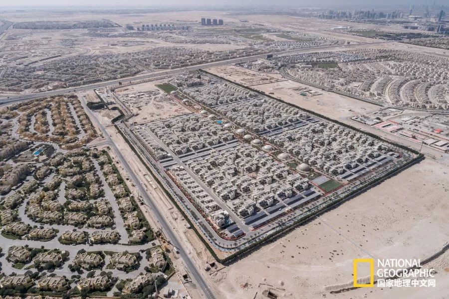 可持续发展城市的街道紧密排列,里面的500 栋别墅彼此屏蔽,降低了对空调的需求。每栋别墅都装有太阳能板,“净零耗能”社区可生产自身所需的全部用电,11座圆顶温室可生产农作物。