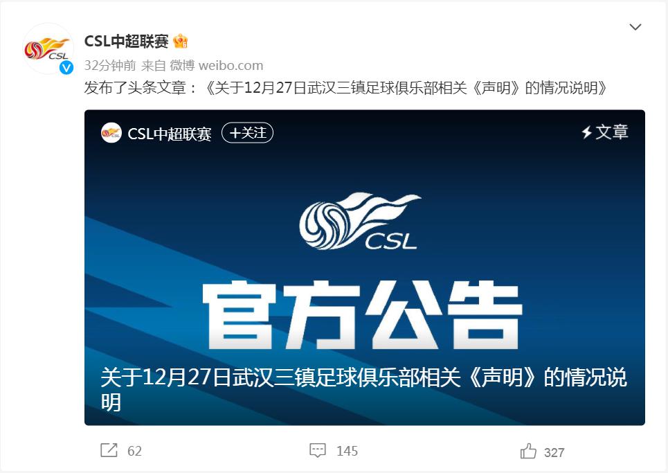 @CSL 中超联赛微博 12 月 28 日消息,中国足球协会、中国职业足球俱乐部联合会筹备组关注到 12 月 27 日武汉三镇足球俱乐部发布有关《声明》,引起社会反响。对此,中国足协、中足联筹备组作如下说明: