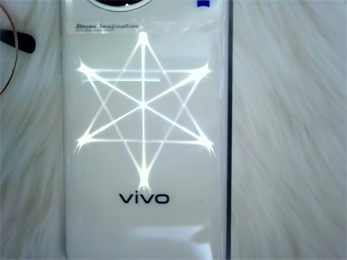 手机的背面采用的是玻璃的后盖设计,日常使用也不易沾指纹,握持感也是更舒适。此次的vivo X90S背面还进行了一个特别的设计,就是当你拿灯光照射手机后盖的时候,会呈现出一个六角形星星的图案,真的泰裤辣。
