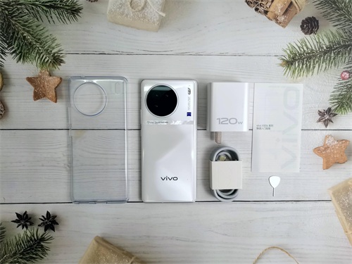 接下来打开盒子,看看此次的vivo X90S有什么配件吧!除了手机本体之外,还有一个手机壳、120W的充电器、充电线、说明书、取卡针。老规矩,给vivo X90S拍张全家福吧!
