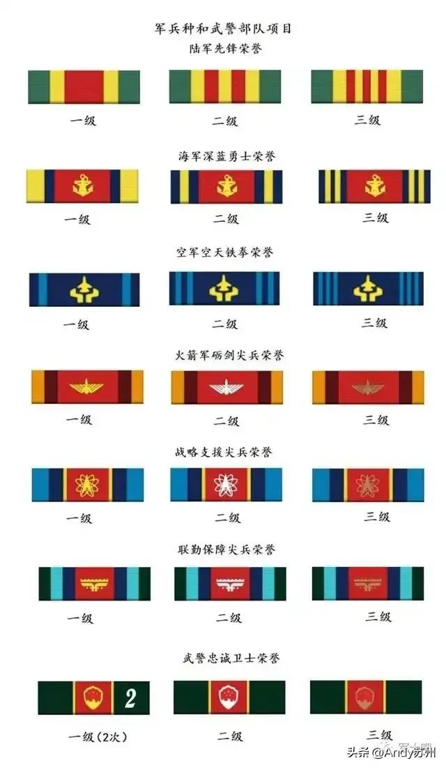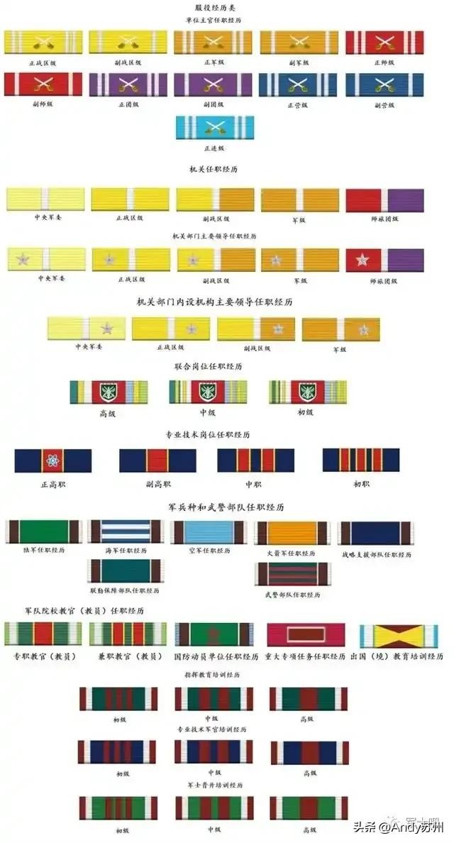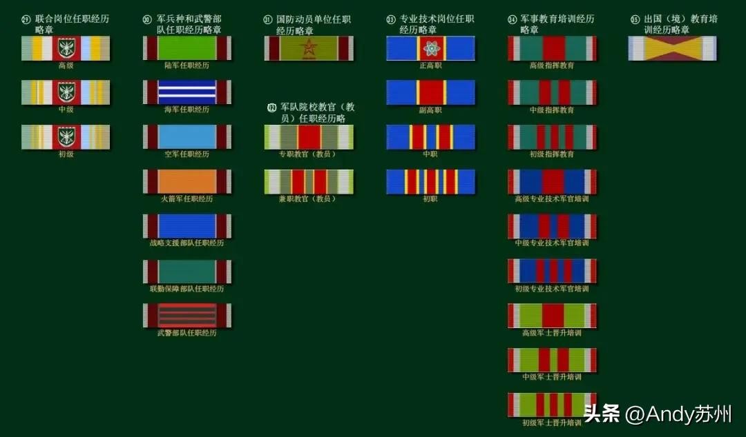 与之前的资历章只有级别与年限略表相比相比,新的勋表共设立功勋荣誉表彰类、服役经历类、岗位职务层级类、服役年限类4类32个项目。