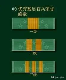 优秀基层官兵略章只佩戴1个最高级别的,多次获得的旁边用数字配件标识