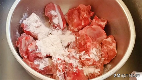 1、把排骨放入一个盆内,倒入适量面粉,面粉有超强的吸附能力,能够洗去排骨上的杂质和油脂,再用清水多冲洗几遍,直到水变清,把排骨捞出。