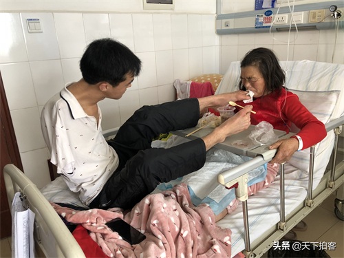 2018年10月9日,母亲突发脑梗塞经湖北民大医院抢救控制住病情恶化,这是陈兹方在照顾母亲(资料图)。