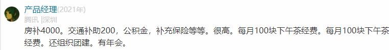 一位产品经理:房补4000。交通补助200,公积金,补充保险等等。很高。每月100块下午茶经费。每月100块下午茶经费。还组织团建。有年会。