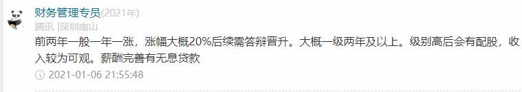 一位财务管理专员:前两年一般一年一涨,涨幅大概20%后续需答辩晋升。大概一级两年及以上。级别高后会有配股,收入较为可观。薪酬完善有无息贷款