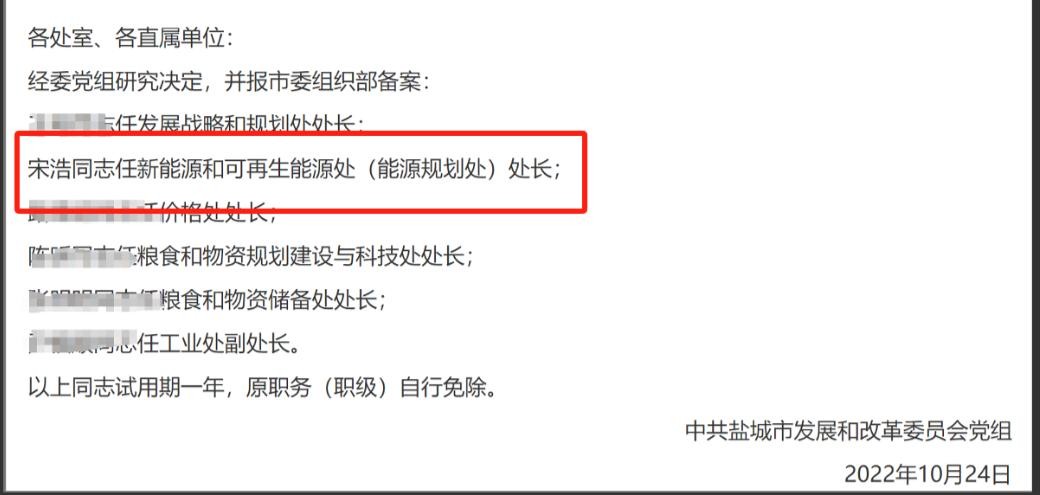 根据公开资料显示,宋处长毕业后一直在盐城发改委工作。2020年,他从一级科员晋升为副处长,成为副科级干部。而到了2022年10月24日,他则晋升为新能源和可再生能源处处长,正式成为正科级干部,仅仅用了2年时间从副科晋升为正科,这样的晋升速度简直像是坐火箭一样。