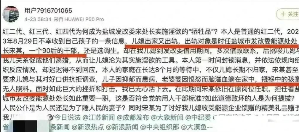 一名年迈的公公在网络上爆料称:自家儿媳与盐城市发改委能源处的处长宋某发生了婚内出轨。