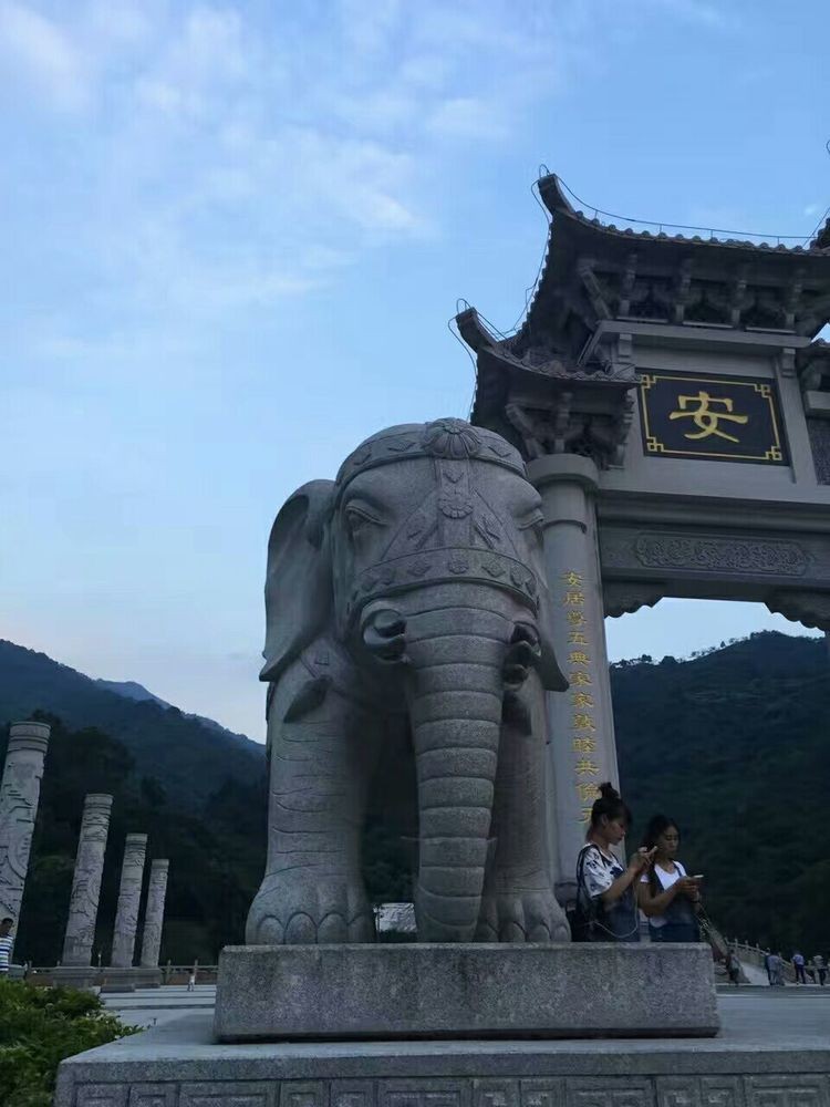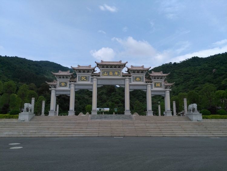 石岩街道大羊台山入口广场,地处宝安区石岩龙眼山村,贯彻了天地人和的建设理念,可以满足休憩游人和健身群体的多样化需求。进入广场,首先引入眼帘的就是气势磅礴的山门,山门正前方台阶中央镶嵌宽8.9米、高2.8米的龙凤呈祥浮雕,山门采用花岗岩传统榫卯工艺制作,六柱十一楼歇山顶,广场两侧正前分别安置一座长6米,高3.3米的六牙神象石刻,象征前程锦绣、万象更新。山门迎面 “国泰民安”、背面“风调雨顺”,寓意国家繁荣昌盛,华夏伟大复兴。进入山门,地面上六榀拼图的莲花地雕,直径26米,广场两侧立八根高6米,直径0.8米的祈福柱,阳刻吉祥图案;对面莲花池四周嵌装十八处蠡首吐水,池中置两墫长3米、高0.6米石刻神龟。横跨莲花池南北设置一大两小三座金水桥,长23米,宽分别为3.3米和2.2米。广场两侧的建筑采用苏派风格,面积共1,432.5平方米。东侧有叠翠堂、接秀亭、涵青亭、凝碧亭、知音阁、爬山廊;西侧有载德楼、揽月楼、清风亭、闻笛亭、五福楼、抱玉亭,所有建筑均采用木构游廊连接。
