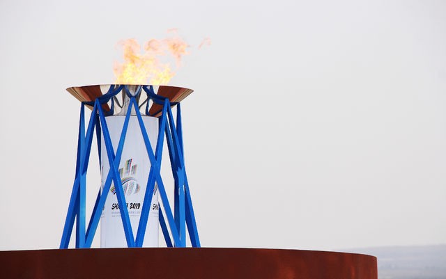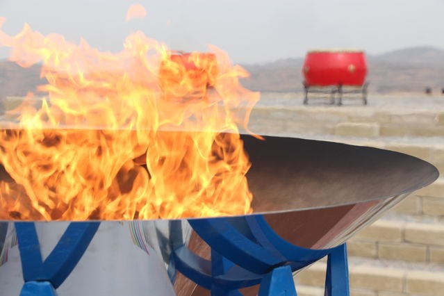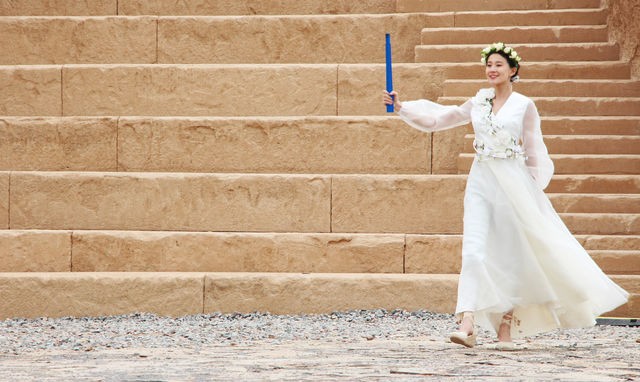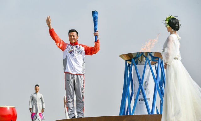 圣火采集现场,圣火少女、中国艺术体操运动员张豆豆随着古朴悠扬的音乐旋律缓步走上通往洞穴的阶梯,来到采火点前,拿着手中的采火棒对着凹面镜进行采火。采火器中火苗渐起,圣火少女手中的采火棒顺利点燃,随后,圣火少女用手中的采火棒引燃火种盆。第一棒火炬手、国家蹦床队运动员董栋从火种盆内慢慢点燃手中的火炬,开始现场传递,仪式现场共有6棒火炬传递,从火种盆至现场观众区,共计约2.5公里,首次采取高空速降传递,从60米高的观景台速降而下,尽显遗迹风貌,突出人类探索前行的过程中,寻找光明的坚定勇气。最后,第六棒火炬手通过现场VR技术,点燃二青会吉祥物“青青”手中的网络火炬,正式开启了二青会网络火炬传递。整个过程古朴大气,体现了传承与创新的完美结合。