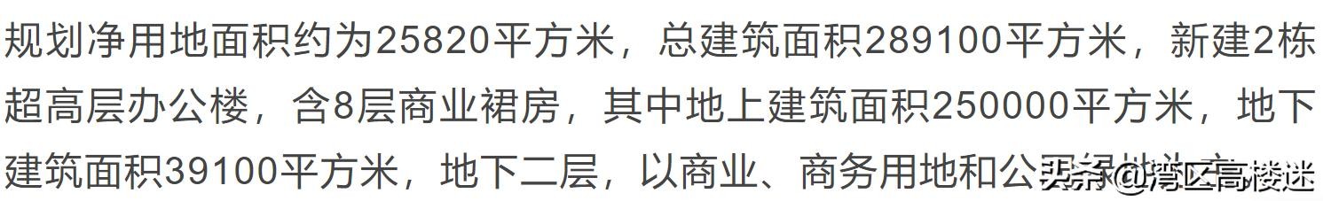 规划净用地面积约为25820平方米,总建筑面积289100平方米,新建2栋超高层办公楼,含8层商业裙房,配套建设1000个地下车位及区域道路、园林、供电、给排水工程。其中地上建筑面积250000平方米,地下建筑面积39100平方米,地下二层,以商业、商务用地和公园绿地为主。