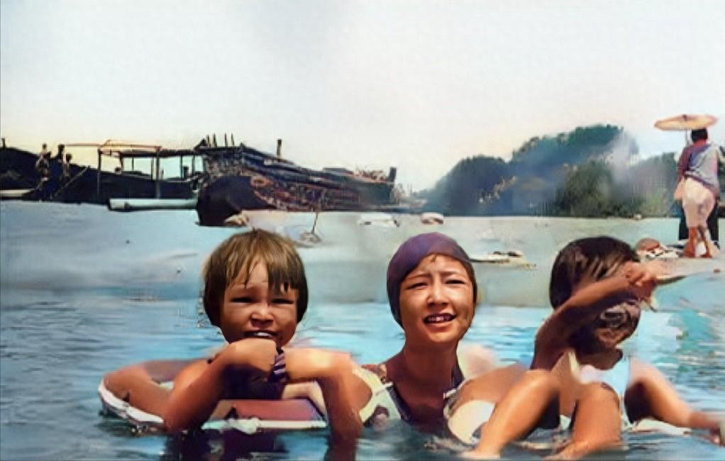 当时,梁思成看着自己的小仙女和儿女其乐融融的画面,微笑着拍下了这张泳装照,泳衣、泳帽、游泳圈都设备齐全,看来梁思成夫妇平时工作之余,也会关注孩子们的成长。