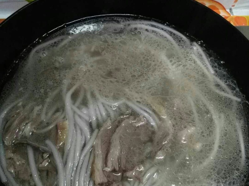 第六步:煮羊肉的汤加少许的水,大概比例是汤水3:1。下入姜末蒜末葱花,把粉条下入煮至粉条熟透。想喝浓点的4:1,但是不建议全是肉汤,这样太油腻。