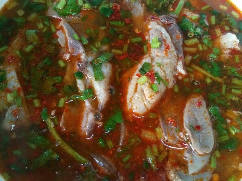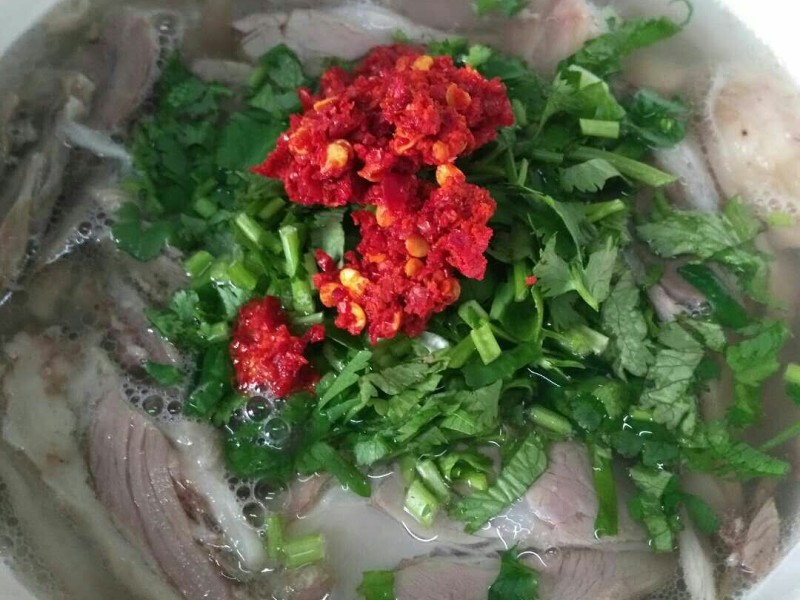 第八步:盛入碗中,放上香菜,油辣子。有些人还喜欢放些蒜苗。