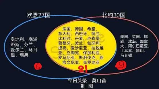 北约组织有30个成员国,欧盟现有27个成员国。