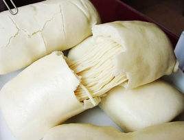 2.另将发酵面团放案板上揉圆后,擀成大型面皮,切成 1 米长的长方形面皮,把面束包住,似鹅脖状,包口朝下,放蒸笼内用旺火蒸 20 分钟使熟即成。成熟后取出,放案板上切成 10 段,装盘即食。