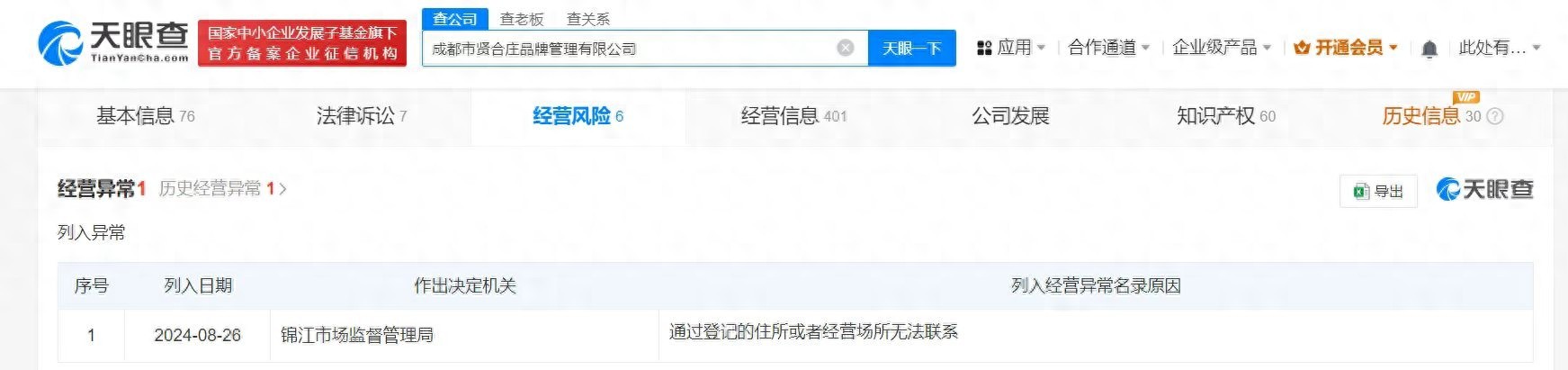 天眼查App显示,近日,“贤合庄卤味火锅”关联公司成都市贤合庄品牌管理有限公司因通过登记的住所或者经营场所无法联系,被锦江市场监督管理局列入经营异常名录。