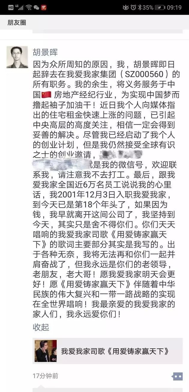 8月18日上午9点,胡景晖突然在朋友圈发布辞职信,宣布辞职。他称,由于众所周知的原因,辞去在我爱我家的所有职务。胡景晖随后在接受媒体采访时称,左晖(链家董事长)给我爱我家集团董事长兼CEO谢勇打了个电话,他被迫被公司“切割”。