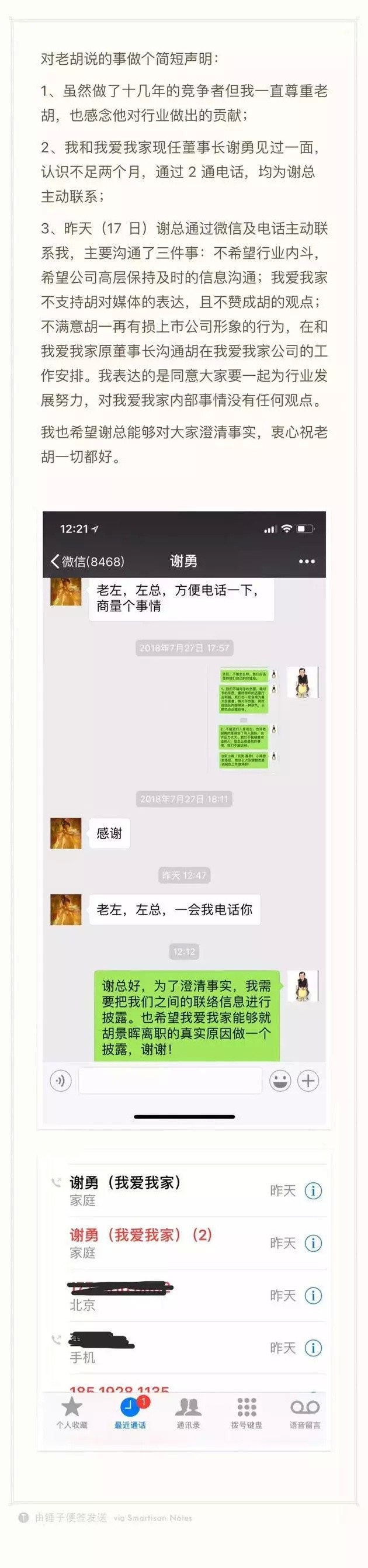 几个小时后,8月18日午间,左晖发布声明,澄清是谢勇主动联系他,至于让我爱我家切割胡景晖,是谢勇自身选择。左晖还强调,“同意大家要一起为行业发展努力,对我爱我家内部事情没有任何观点”。