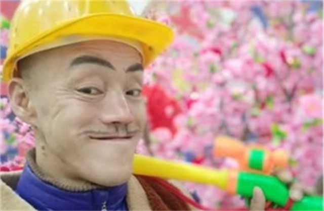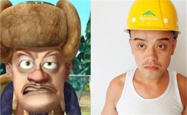 图片上的人戴着黄色安全帽做鬼脸,嘴角的八字胡颇具喜感,神似动画片《熊出没》中的动漫人物“光头强”。