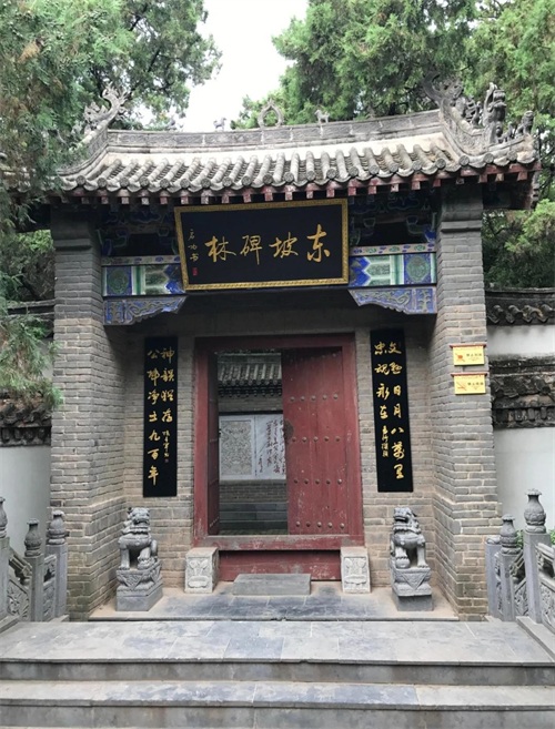 广庆寺下边的东坡碑林是二十世纪九十年代中共郏县县委、县人民政府为纪念苏东坡先生仙逝九百周年,利用民间之资兴建的,选苏轼300幅诗、词、文作品刻勒而成。1997年下半年筹划,经过约稿、成书、雕刻、建廊、镶嵌等项工作,2000年底峻工。碑林大门迎面正墙壁上,是红色复制的毛主席手书的《念奴娇.赤壁怀古》。据说此一内容的碑刻在碑林中有100通。参与书写的有启功、欧阳中石、沈鹏等当代书法大师,草、行、楷、隶、篆诸体皆备,呈现出豪放、细腻、灵动、古朴、精致和险峻的不同风格,蔚为壮观。碑林除了体现纪念苏东坡先贤的主题外,还真实的反映出中国当代书法人的笔下功夫