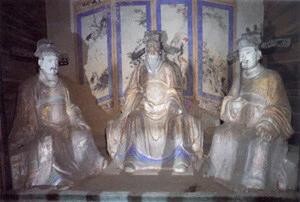 大殿后面是三苏祠,三苏祠建于元代至正年间,祠内保存着元代所塑的三苏父子泥塑像,距今已600多年。苏洵居中,苏轼、苏辙分列左右。元代三苏塑像在全国仅此一处,具有很高的文物价值。