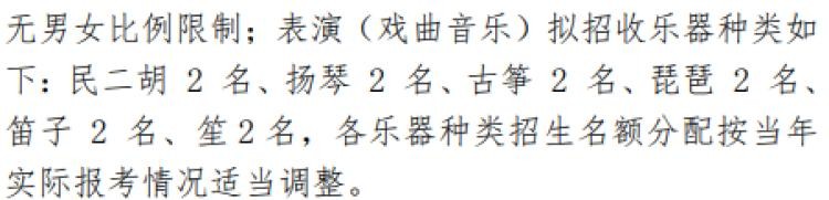 上海戏剧学院在春考新增了两个专业,分别是播音与主持艺术、表演(戏曲音乐)。表演(戏曲音乐)拟招收乐器种类如下:民二胡2名、扬琴2名、古筝2名、琵琶2名、笛子2名、笙2名,各乐器种类招生名额分配按当年实际报考情况适当调整。