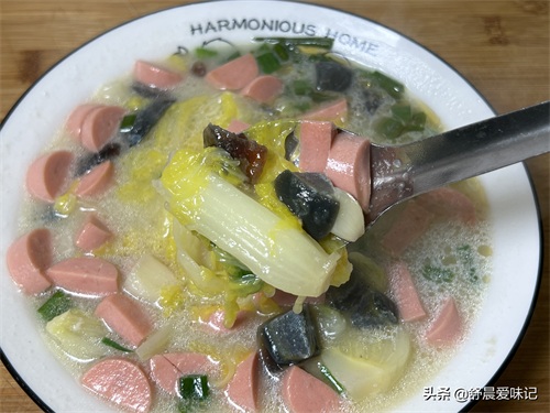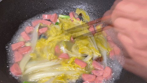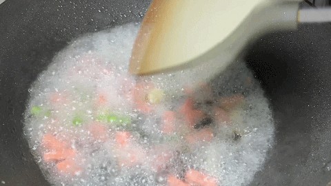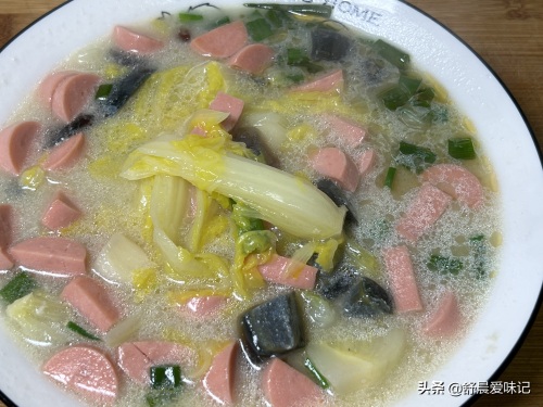 2、 蒜粒炒香,加入皮蛋丁,火腿肠丁和葱段翻炒,加入开水煮这样做汤汁浓白
