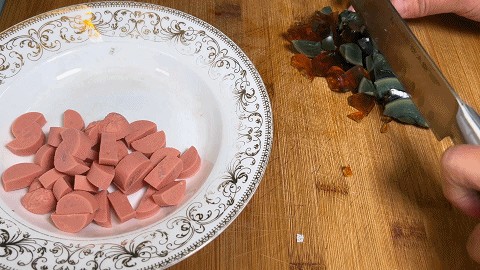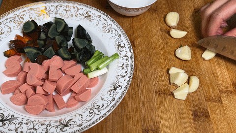 1. 火腿肠一根剥去外皮,从中间切开,再切成丁