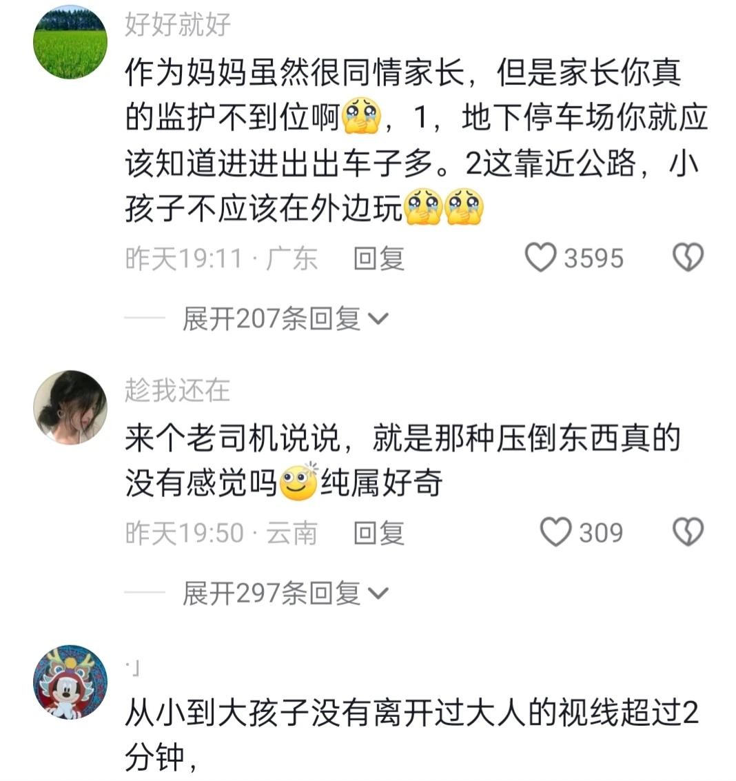 有网友说: 谁会故意把人压死 请问?评论里那么些带节奏的 严惩司机?车都有保险…事故谁也不想发生 多做安全教育 当父母的多上点心