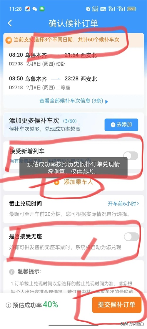 越到后期候补订单越多,排队周期就越长,买票成功率就越低。候补订单里一次提交3个车次订单,成功率更高,一个车次相对能低一点。