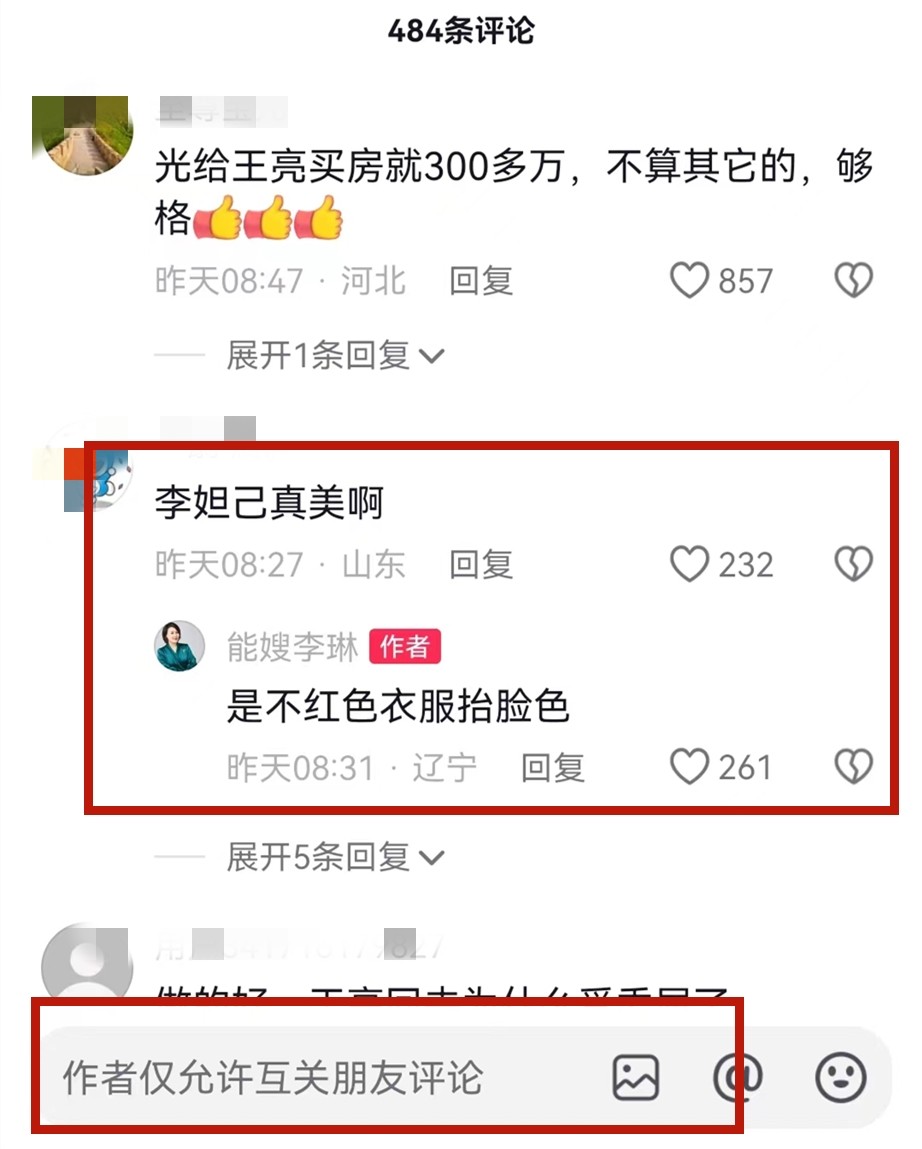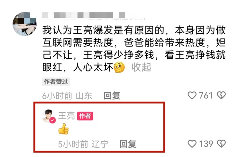 因为王亮没有说具体原因,有网友就在评论区留言猜测,是因为王亮做互联网需要热度,父亲王小利能给他带来热度,但是后妈李琳不让,嫉妒王亮挣钱多,王亮点赞了网友的这条评论,并且还回复了一个点赞的表情。