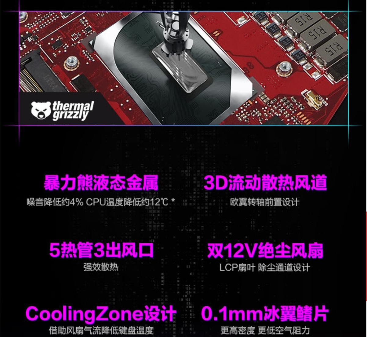 可能有不少低价游戏本在散热上会进行缩水,但是ROG魔霸新锐没有这么做,而且还上马了黑科技——暴力熊液态金属散热,通过液态金属可快速将CPU产生的热量传导至散热模组上,温度降低约12度左右,再配合冰川散热架构2.0的5热管3出风口全方位导热、3D流动散热风道以及双12V绝尘风扇等技术,让电脑在高负载的游戏环境下感觉不到发烫严重的现象,冷却力长效稳定,稳定性提升。