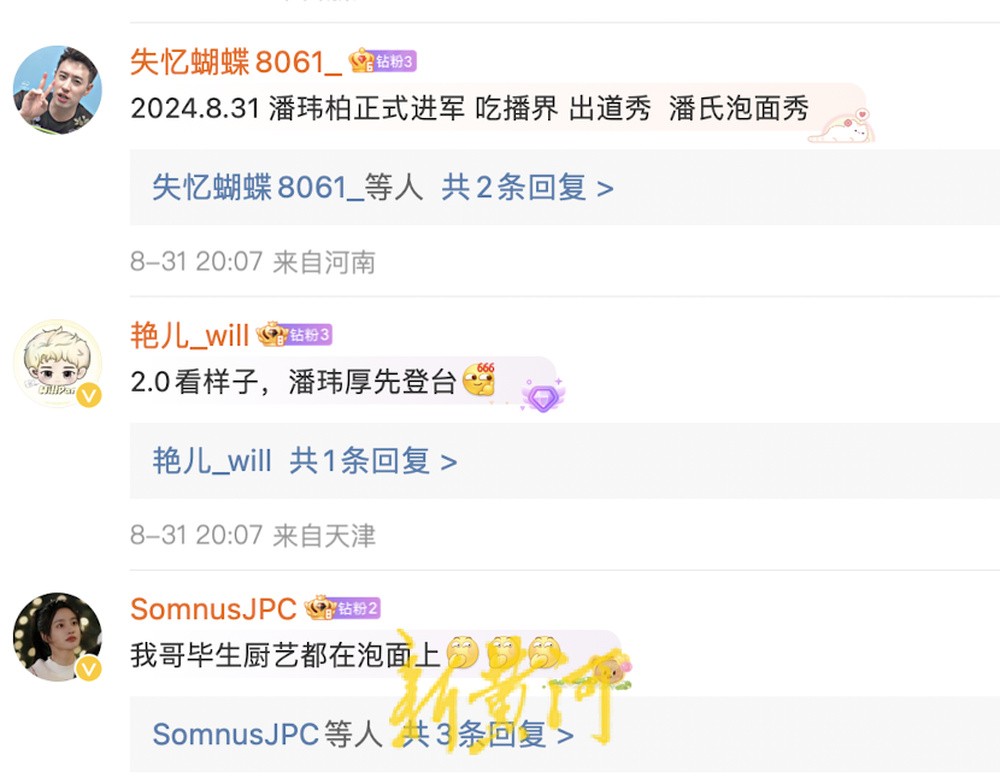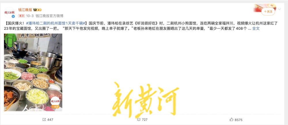 在他的社交账号收藏夹里,全是各地美食探店指南,被网友称作“潘玮柏严选”。刚过去的假期,潘玮柏曾经二刷的面馆也因为他的光临而出圈,店主说“他下午发完视频,晚上就爆单了”。